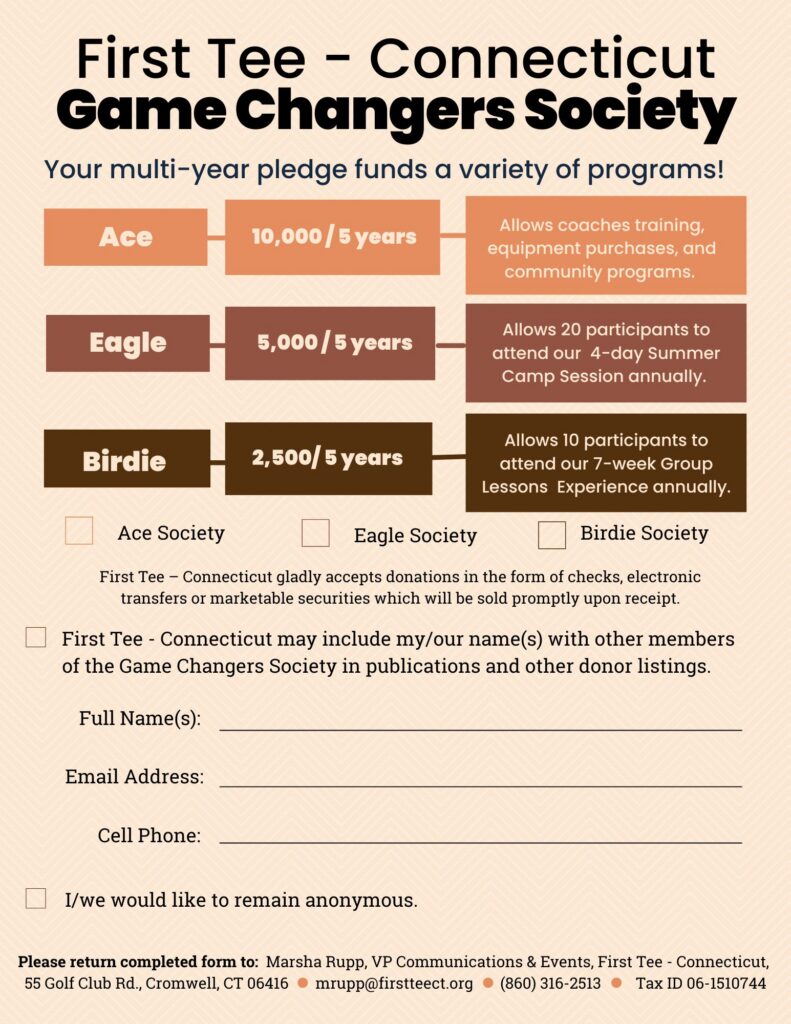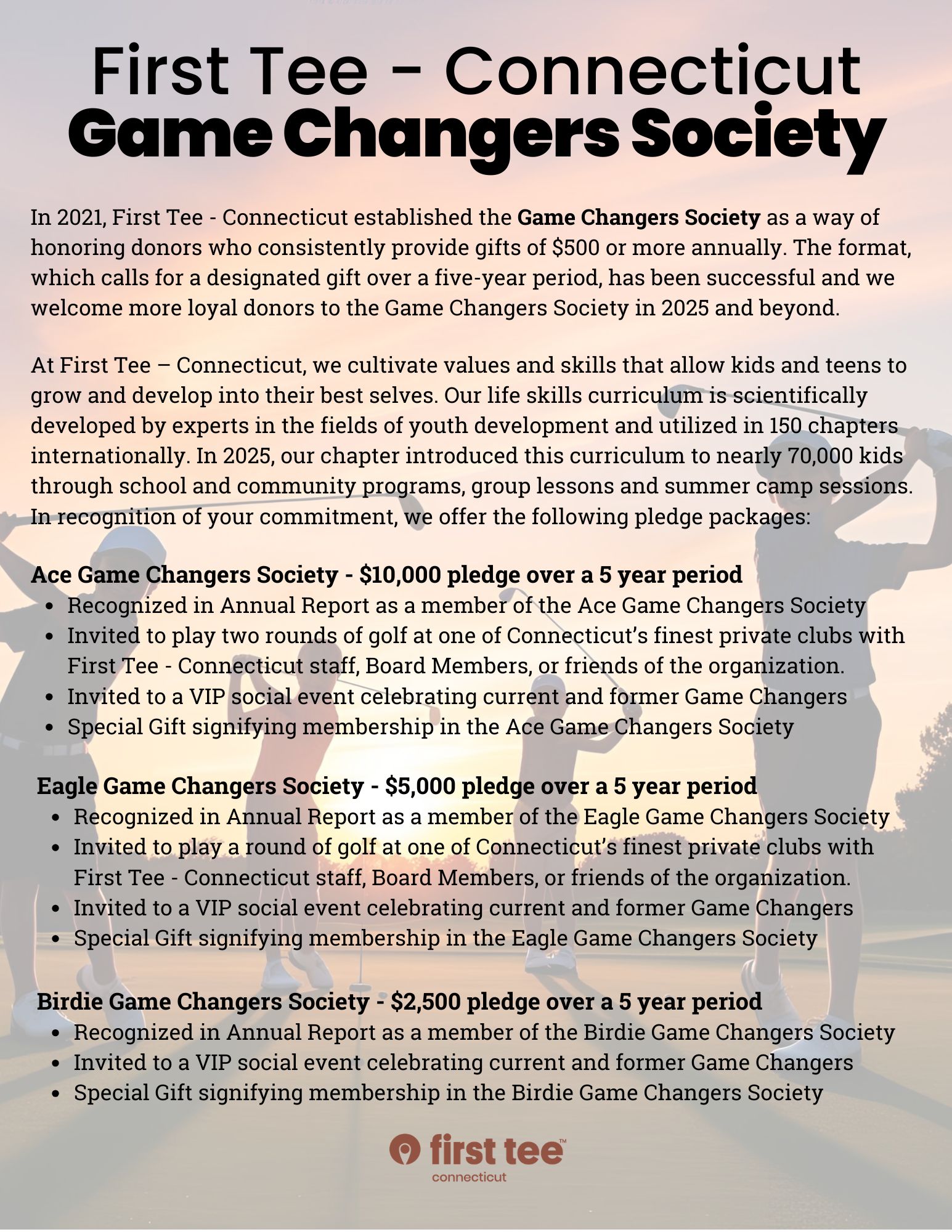 First Tee – Connecticut established the Game Changers Society in 2021 as a way to extend certain benefits to our loyal donors who decide to make multi-year commitments. There are three levels of giving over 5 years – Ace ($10,000), Eagle ($5,000) or Birdie ($2,500). These commitments may be customized to suit our donors, and exclude sponsorships of our Charity Classic fundraisers.