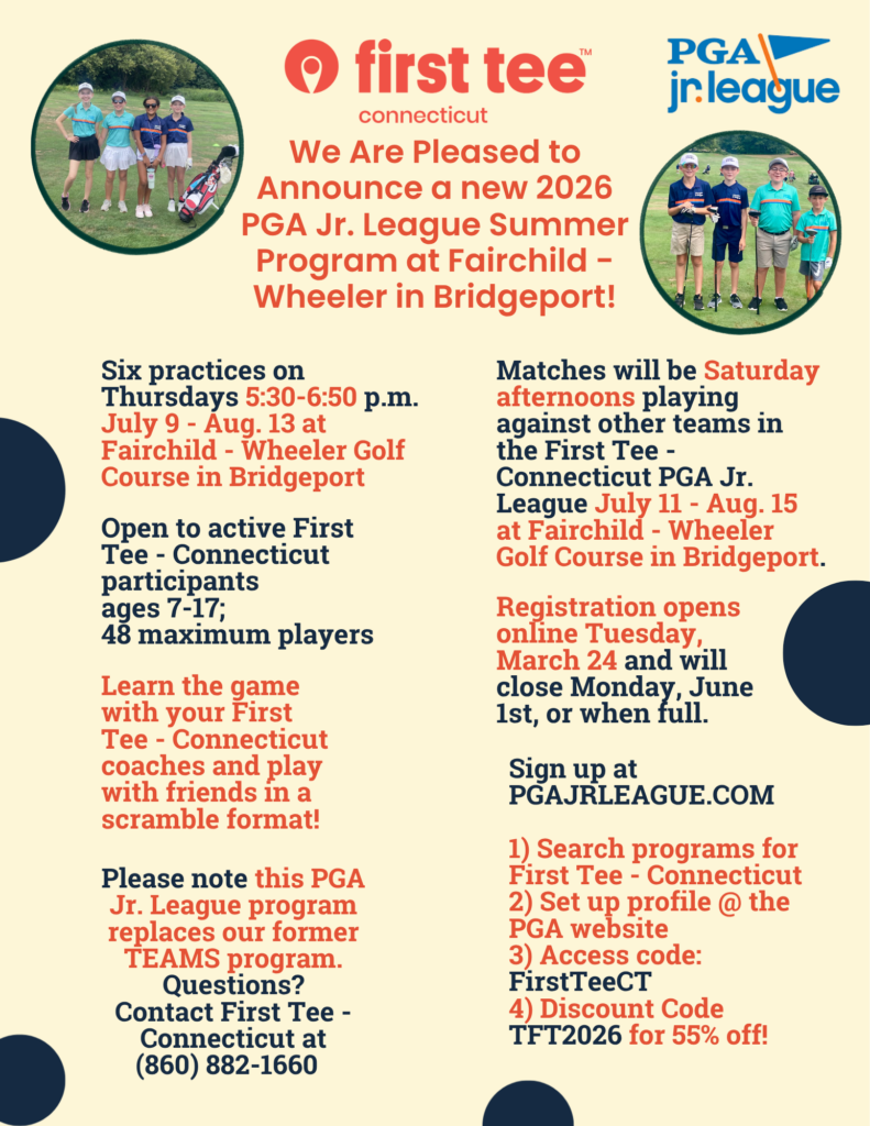 - Access Code and Discount Code for First Tee – Connecticut Participants only: FirstTeeCT