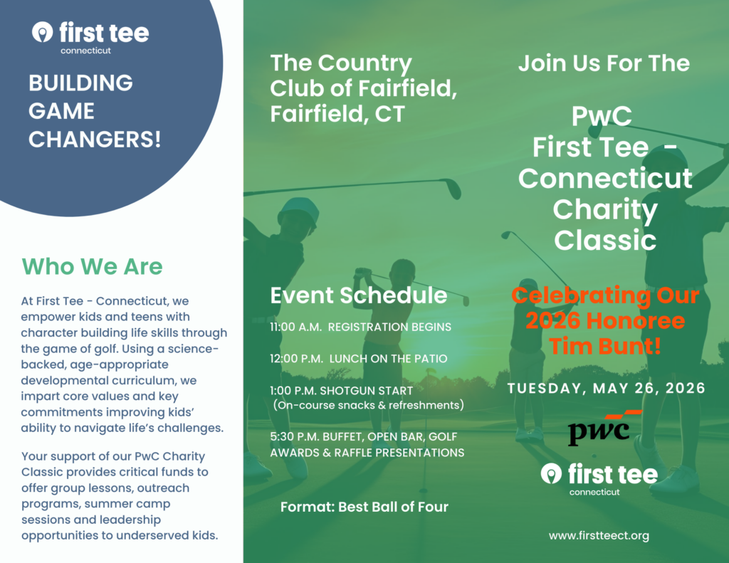 The PwC First Tee - Connecticut Charity Classic at the Country Club of Fairfield will take place on Tuesday, May 26, 2026. Registration is currently open, reserve your spot now!
